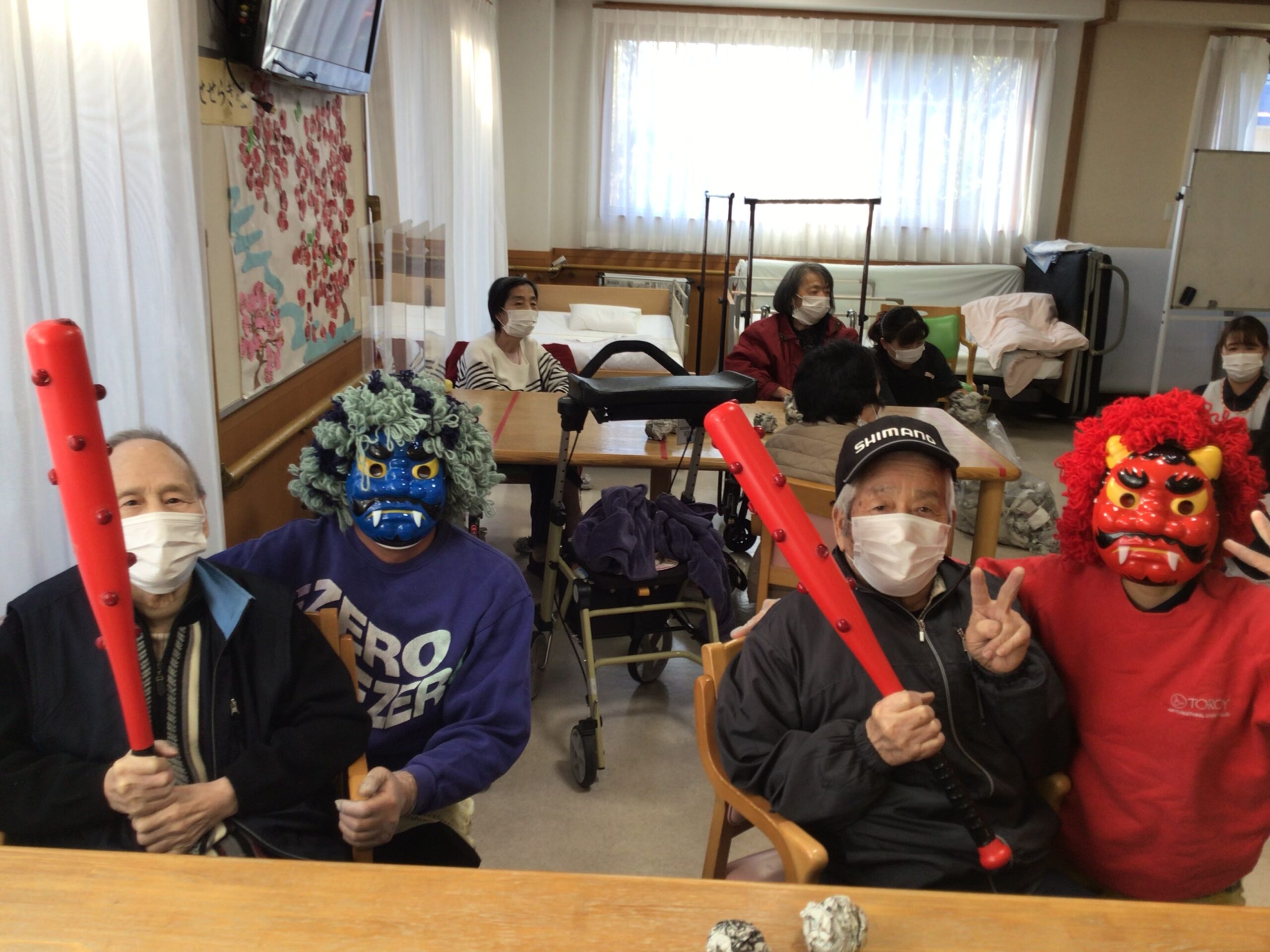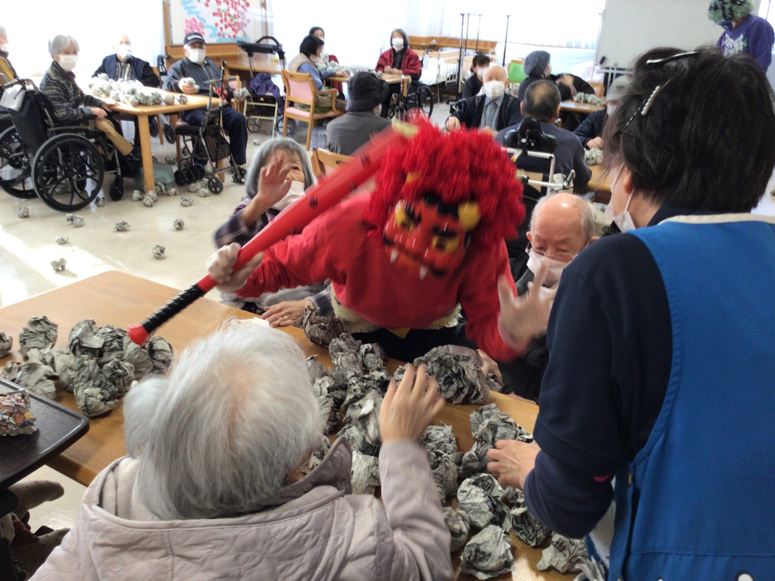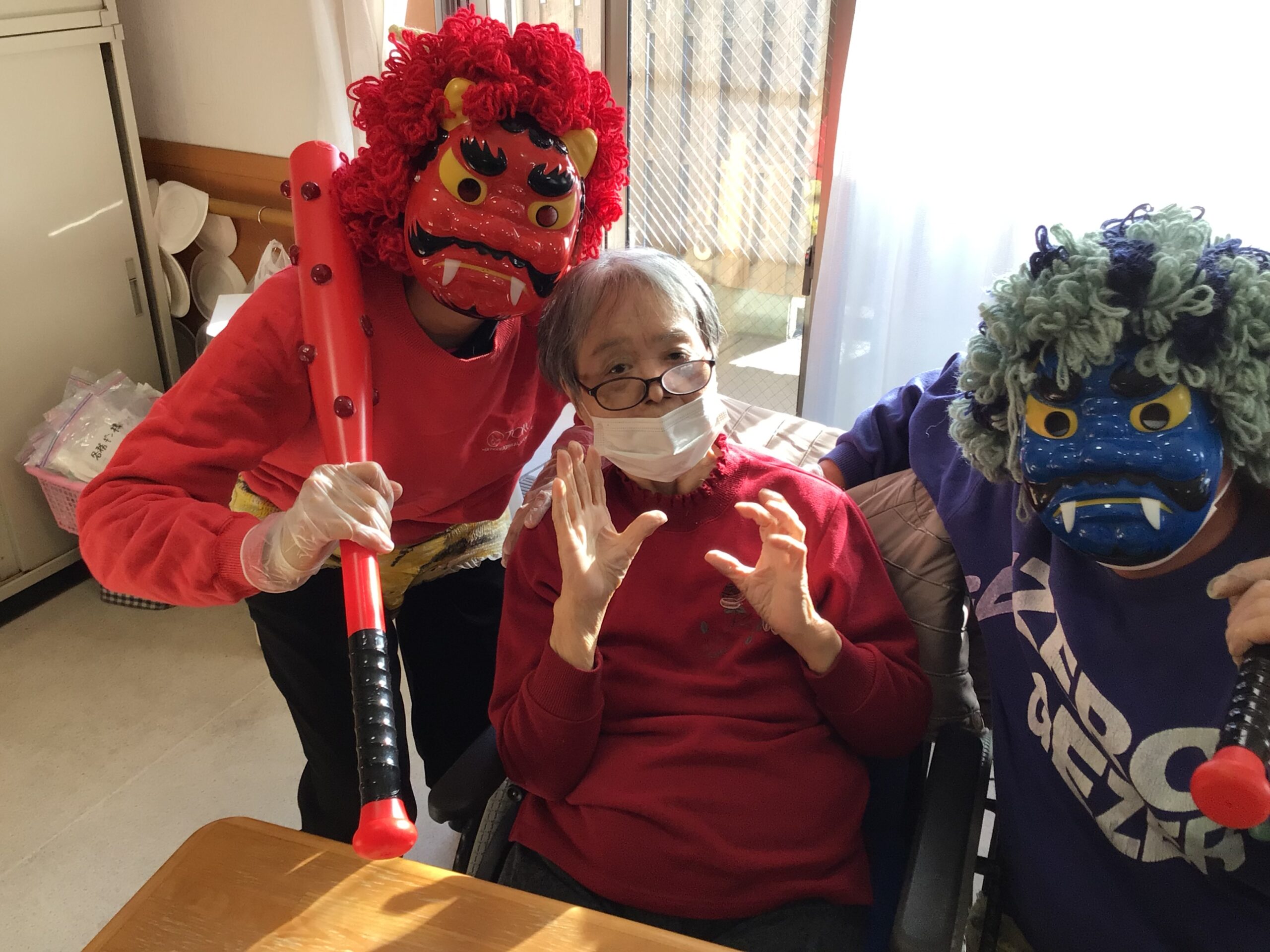 利用者様はびっくりされており、「鬼は外~!」と必死に豆を投げられていました👏